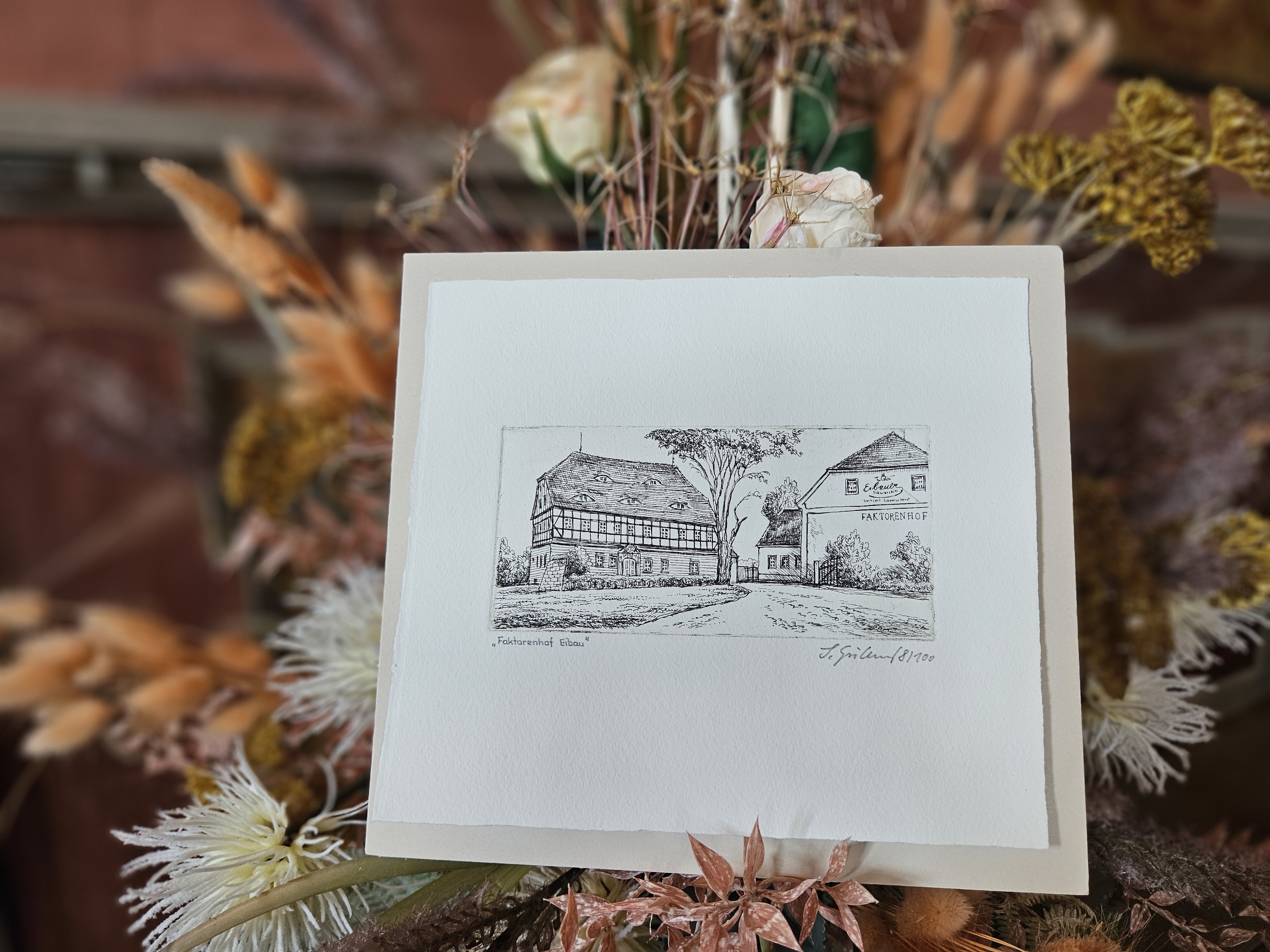 In Vorbereitung auf die ab Dezember 2025 geplante Sonderausstellung mit dem Titel „Die romantischeSeele der Oberlausitz“, hat Maler & Grafiker Steffen Gröbner seiner Kreativität freien Lauf gelassen und eine wundervolle Ansicht des Faktorenhofes gezeichnet. Dabei handelt es sich um eine Ätzradierung. Diese ist ab sofort in den Ausführungen schwarz/weiß und color erhältlich. Zudem ist jedes Exemplar persönlich von Steffen Gröbner signiert, nummeriert und nur in einer limitierten Auflage erhältlich. Ob als Hochzeitsgeschenk für Paare, Mitbringsel aus dem Urlaub oder einfach als Geschenk für die Familie aus Liebe zur Heimat. Diese kleinen Kunstwerke sind etwas ganz besonderes und ab sofort bei uns erhältlich.